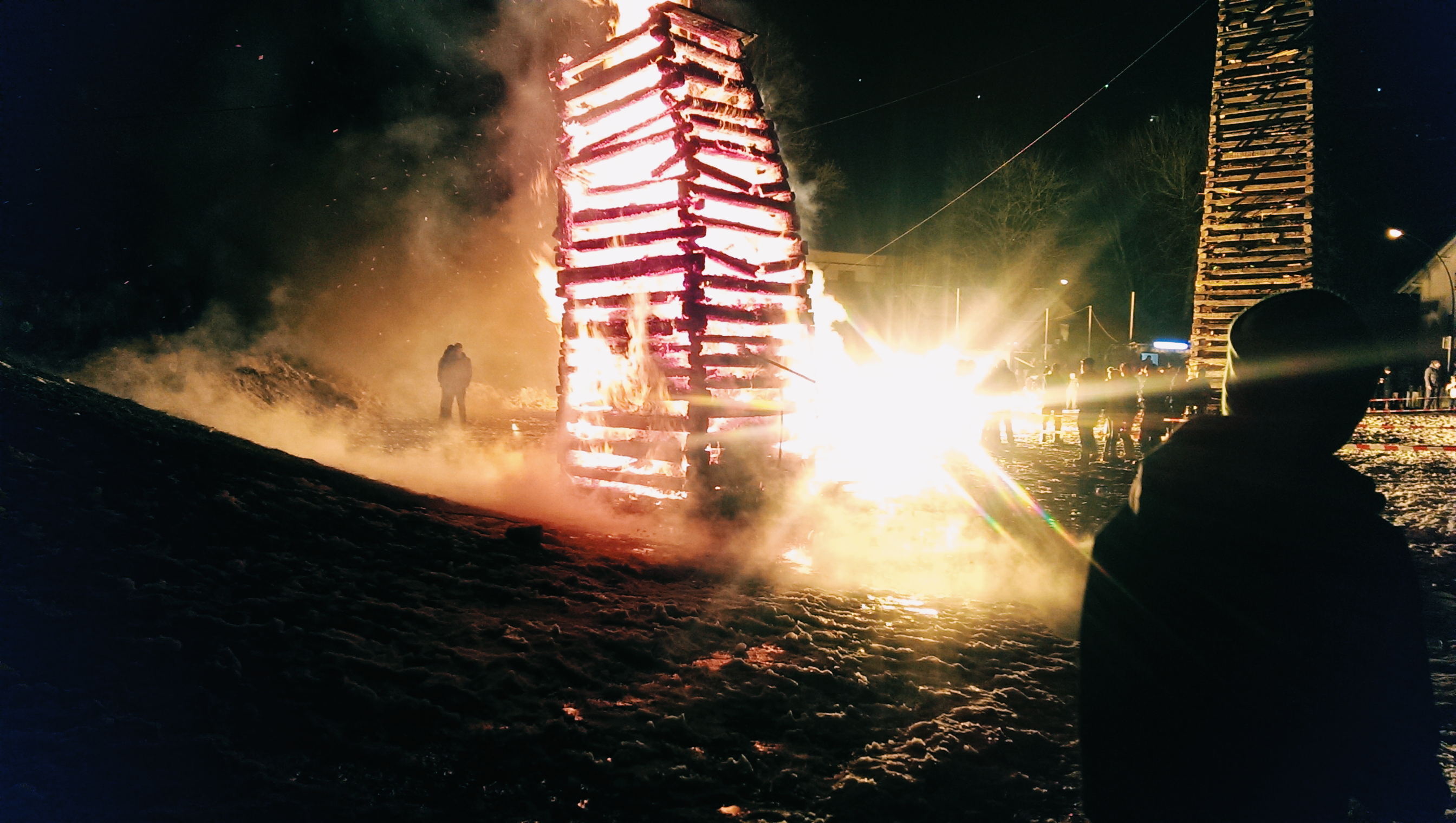 Isabella and I then went down to the common room where we interrupted a boy sleeping (which I’d accidentally done a few days in a row). Curious as to why he had not yet moved from the couch in four days, we asked what was going on. Turns out he’d been locked out and was somewhat homeless and moneyless and toothbrushless (which wasn’t ideal as he has braces). We invited him up for baked eggs for lunch and I had a second toothbrush (thanks mum) and toothpaste which I could give him. We then went for a big walk round the mountains where we saw them setting up for ‘Funken’ that night which is a big tradition of burning two (fake) figures on top of piles of wood to farewell the winter. We got some traditional funken savoury cakes and walked home to have a bit of a jetlag nap and head back out again with lots of other exchange students.
