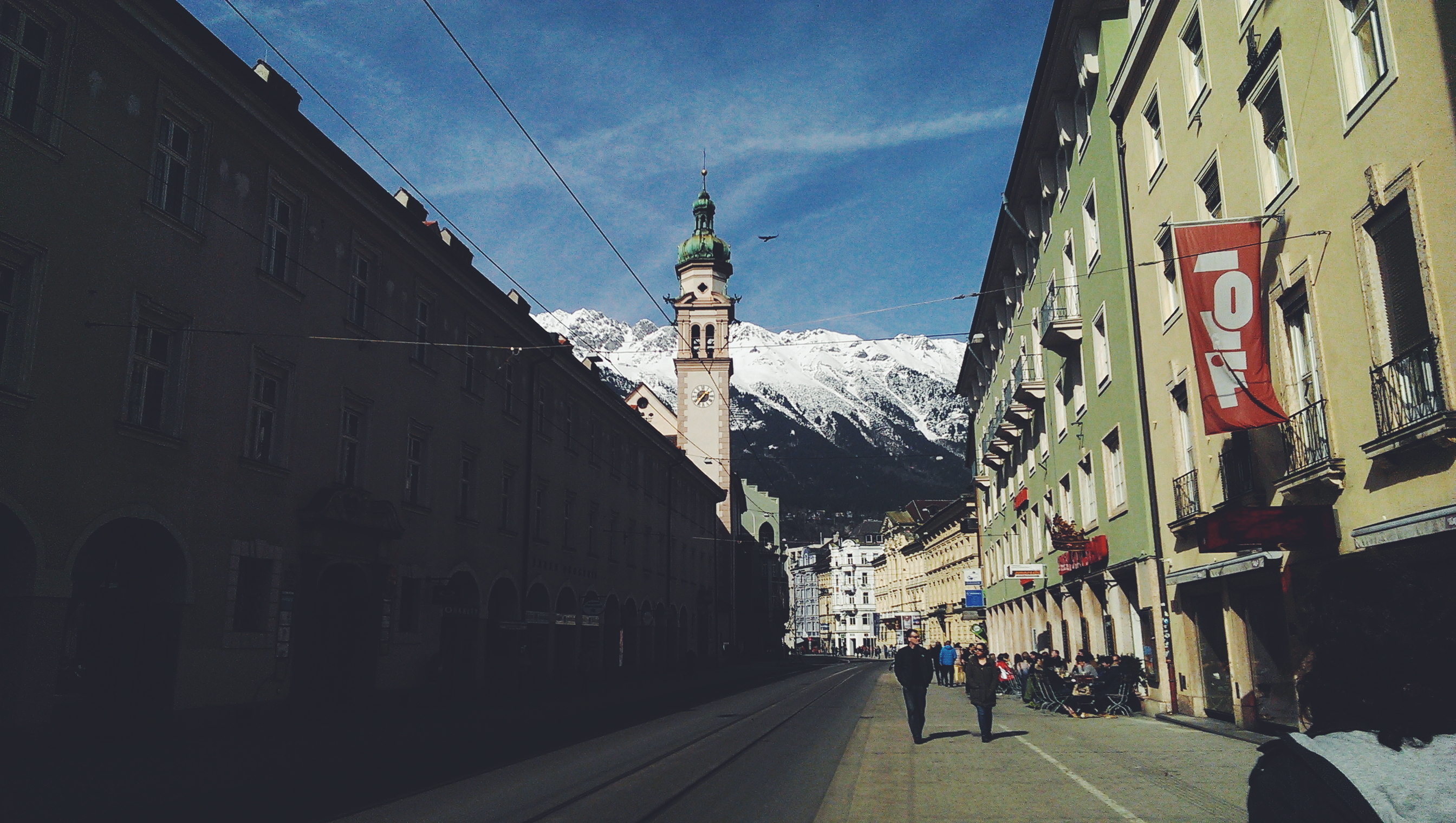 On arrival to Innsbruck, we separated and walked around the city for the afternoon. Adam and I climbed up a city tower where we got a view over it all. The colours of well designed Austrian buildings were phenomenal set against a backdrop of white capped mountains. There’s also a huge ski jump which made for a good sight. We met up with the others after a couple of hours, where Stefan noticed a local shooting hoops and had to join being an avid basketballer himself (as you would be, being just under 2m tall.) We watched for a while then had an early dinner at Vapiano. I picked up a vegetable and mozzarella strudel instead which was fantastic. We piled back into the van, and watched the sun set behind the Alps as we started the 2 hour commute back to Dornbirn – exhausted, but satisfied by fantastic weekend.