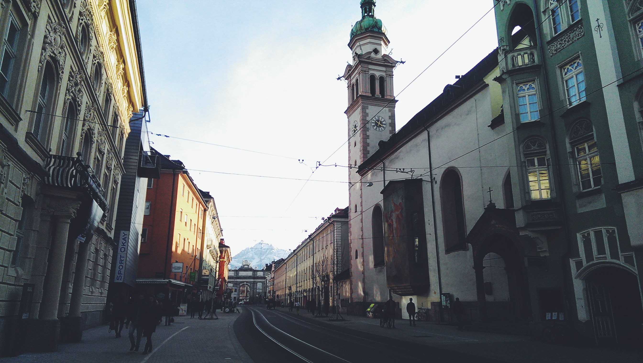 Sunday morning we awoke and headed to Innsbruck, somewhat sleep deprived but still full of high spirits particularly thanks to DJ Adam. A gas station pick me up also helped (baked rolls and curry wurst trump your usual Cornetto/Mars Bar selection.) The drive there was INSANE. We travelled through the alps, sun shining down, admiring little churches on big mountains.