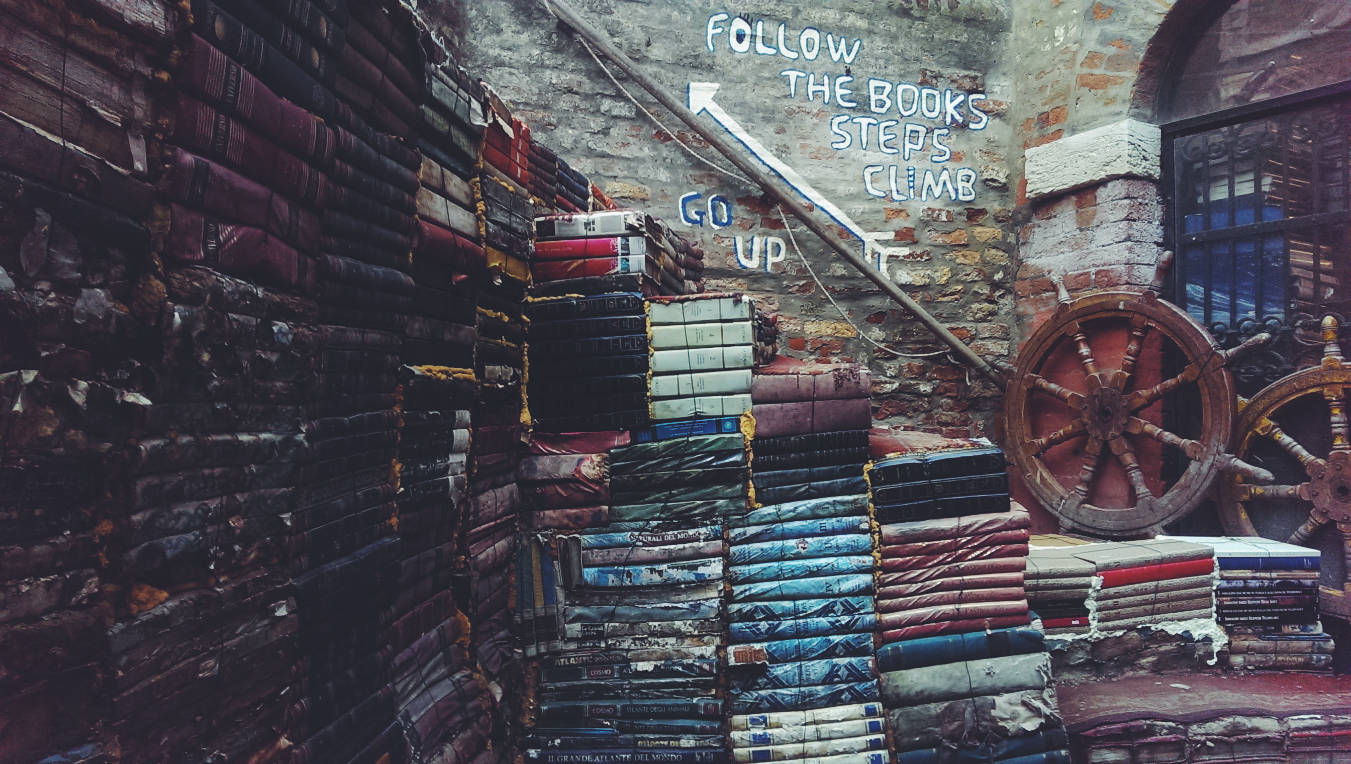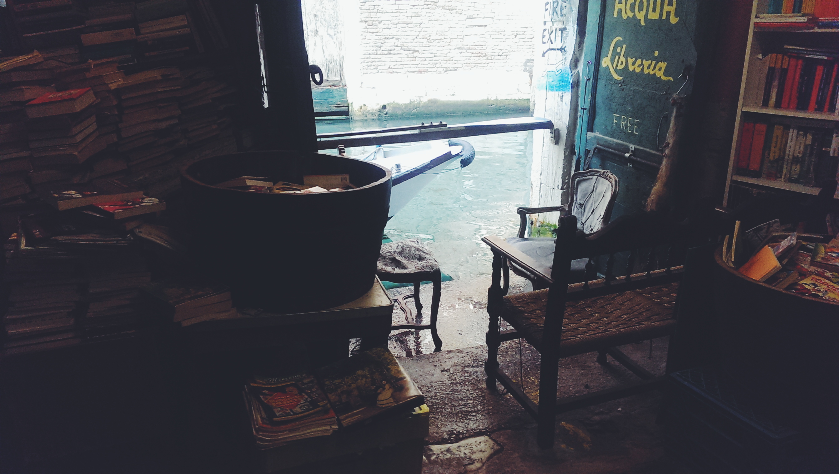 - Visiting the ‘best bookshop in the world’ (potentially self titled) but was seriously amazing. It was run by this crazy old man who had empty gondolas and bath tubs full of books in this low roofed room. There were thousands and thousands stacked upon one another. He’d even made stairs out of them where people could walk up and look over the canal.