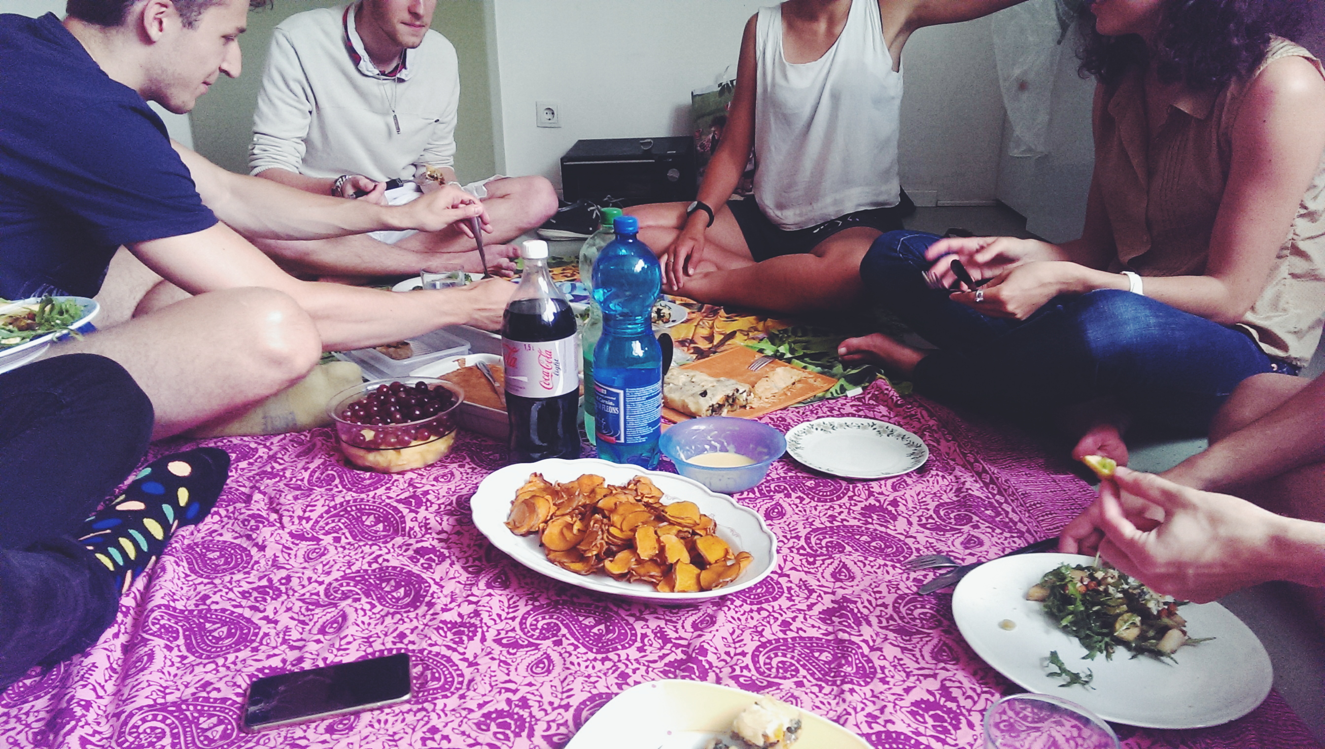 Directly after, I headed to the markets to meet Isabella and Maddie and Maddie’s brother Nicol who was visiting from Sydney. We pottered around and then went out to breakfast where we got coffee and rhubarb slice/bagels. It was really lovely. That night they and a couple of others came over for a small, impulsive picnic in my room to introduce Nicol to some of Maddie’s friends here. We had apple crumble, apple cake, blue cheese and roasted nuts salad, vegetable strudel, olives, crepes and good conversation. Despite having originally thought we’d head to the river, the humidity meant we stayed at mine well into the night. Dinner turned into dessert which then turned into impulsively taking photos for Isabella’s magazine project. After everyone left, Aurelien, Isabella, Thibaut and I hung out for a while which has been a bit of a habit this week.