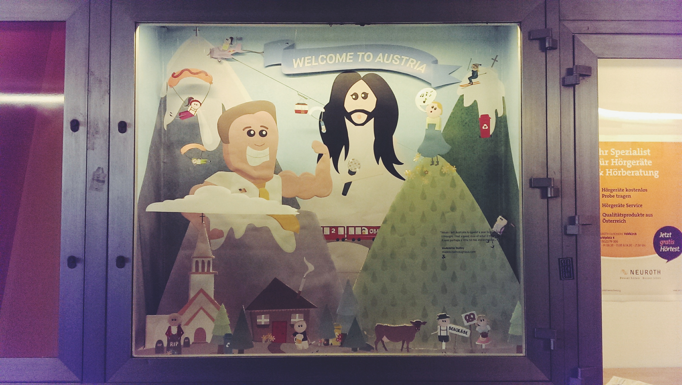 I got to partake in a few projects whilst I was there including making a stop motion video. The final one to wrap up though was a display window at the local train station. I was given free reign and pushed towards drawing my perspective of Austria. They didn’t want the window to be too branded as them but saw it more as a creative space. This was very kind. It turned out to be a huge project though. Having drawn the design, I decided to get it printed on different layers and then install it into the window – some elements being propped up in Z space, others hanging. The cardboard wasn’t thick enough so this resorted in being donated carton from the printer (who also printed all my stuff for free! gem!) which was then scalpeled out and acted as a backing for the printed layers. Fortunately I have a friend like Maddy who offered to swing by on Thursday and help, speeding up the process. My bosses took us all out to lunch and gelato as a thank you which was super kind. We still didn’t finish though, so I came in at 5am the next day to wrap it up. Mathis and Patrick helped me install the work into the window and it was finally done at 5:45pm on Friday, followed by celebratory pavlova (hideous oops) and prosseco. Here are a few photos of it. Unfortunately being in a dark tunnel, it’s hard to shoot but I’ve also included a picture of the original file ft. Arnie, Sound of Music, Conchita, Bratwurst, Churches, Mozart etc